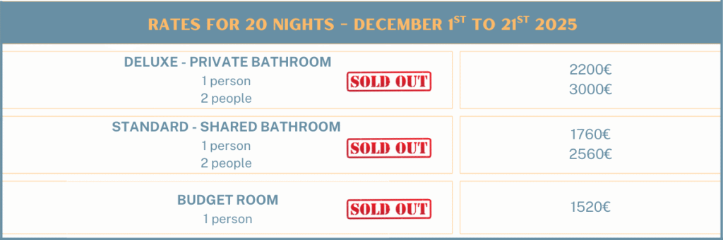 Once approved, a deposit payment of 50% will be required to confirm your reservation, and final payment will be charged on the day of arrival. Extras and costs accumulated during the stay will be paid at the end of the experience.