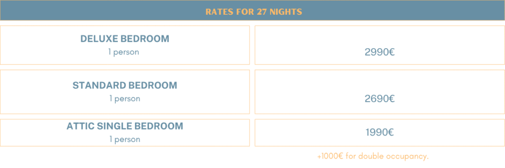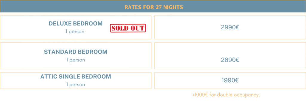 A 50% deposit is required upon reservation and final payment will be charged on the day of arrival. Extras and costs accumulated during the stay will be paid at the end of the experience.
